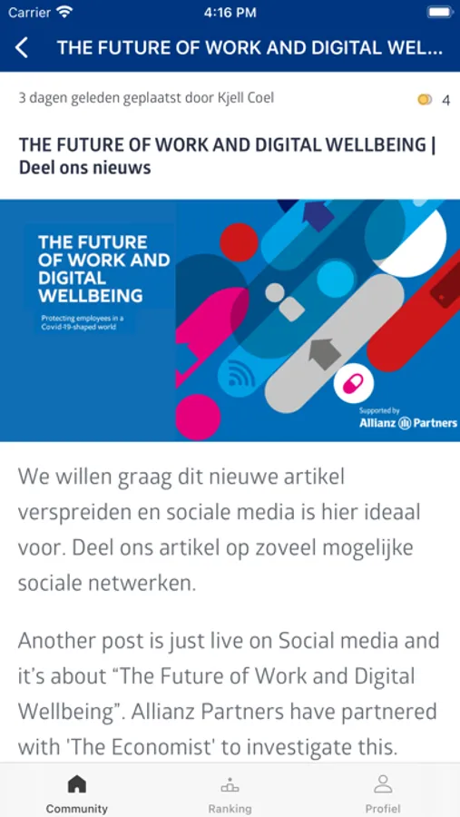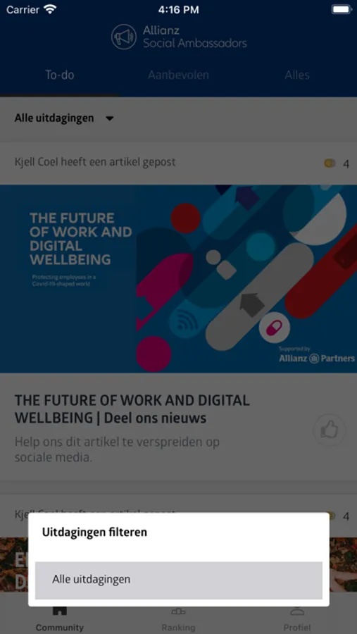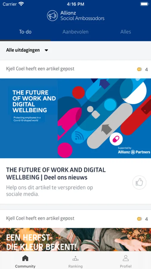 Maak deel uit van de Allianz Social Ambassadors en je bentals eerste op de hoogte van nieuwtjes, die je kunt delen met je relaties enkennissen. Krijg ook een exclusieve blik achter de schermen en zeggenschap via polls. Want jouw mening telt. Waar wacht je nog op? Word vandaag nog Allianz Social Ambassador.