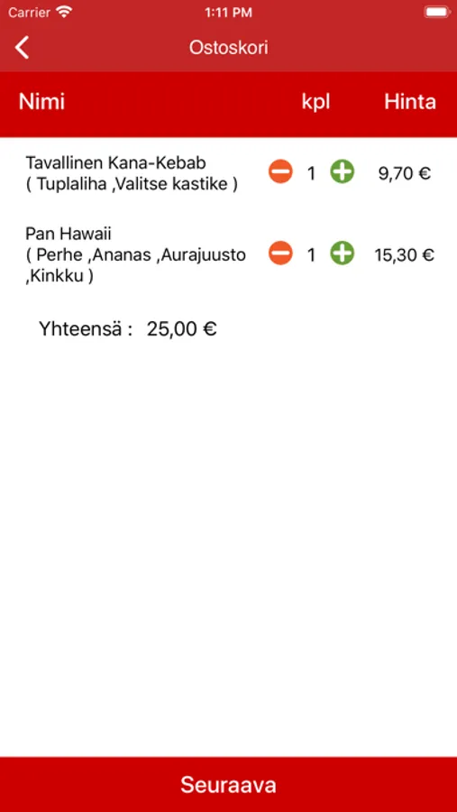 Tilaa pizzat ja kebabit noutona tai kotiinkuljetettuna. Tarjontaamme kuuluvat PIZZAT, KEBABIT, Pannupizzat, Kana Kebabit, Kanasisäfilet, Falafel, Leikkeet, Burgerit, Nugetit, Salaatit ja JUOMAT.