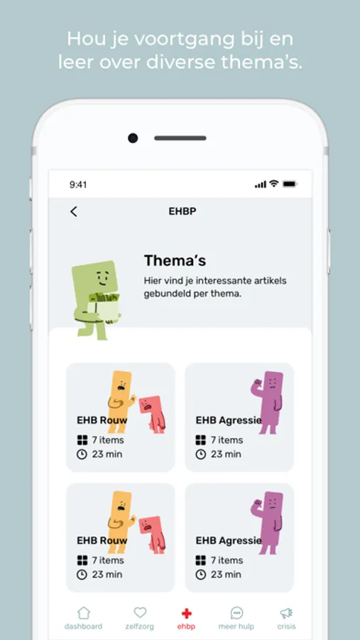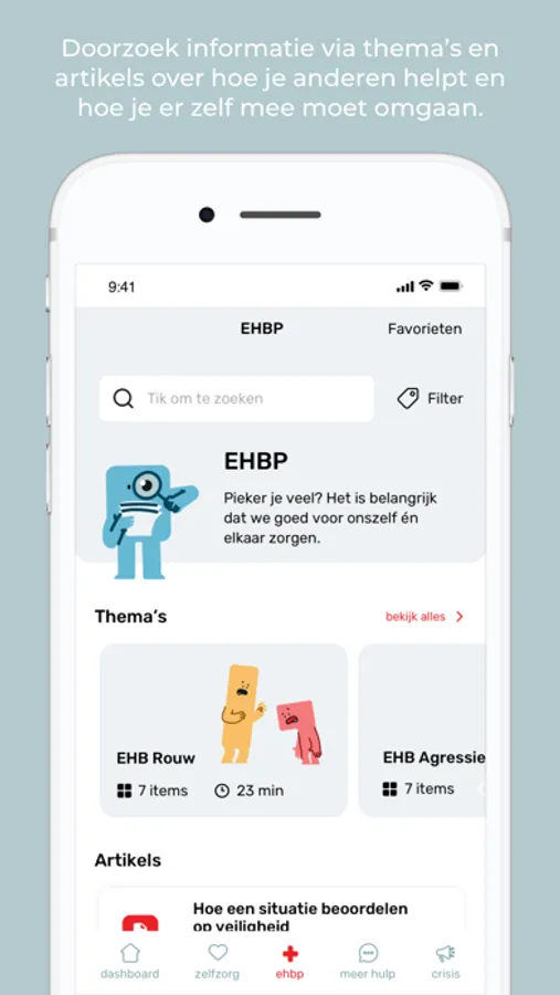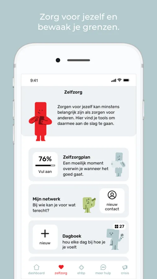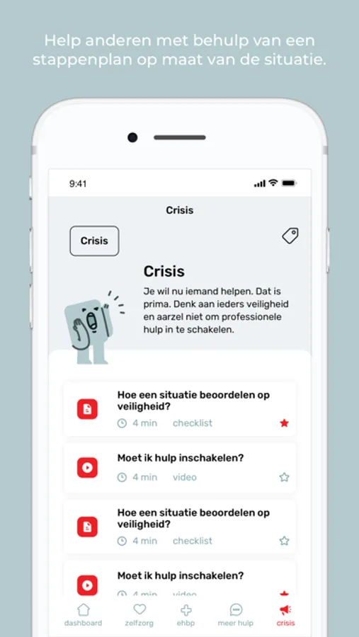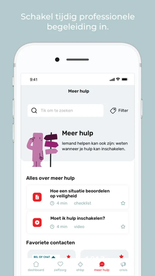 Opgelet! Deze app is geen vervanging van professionele hulpverlening. Neem contact op met de hulpdiensten (bel 112) als iemand een crisis doormaakt. Voor alle andere vragen kan je terecht bij de huisarts, het Centrum voor Algemeen Welzijnswerk (CAW) en Tele-Onthaal (106).