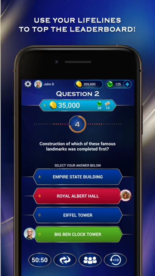 Stumped on a tough question? Use your gems to buy lifelines. Just like on TV, use 50:50 and Ask the Audience, as well as BRAND NEW lifelines: Switch the Question and +10 Seconds.