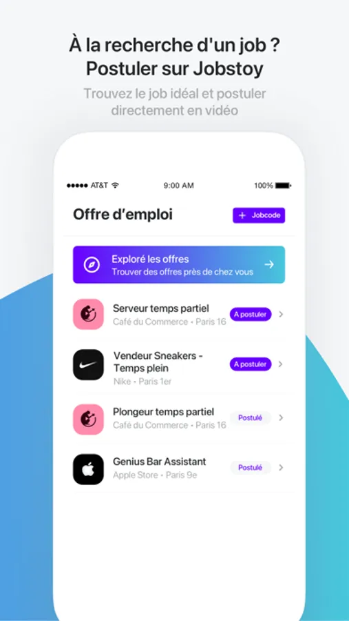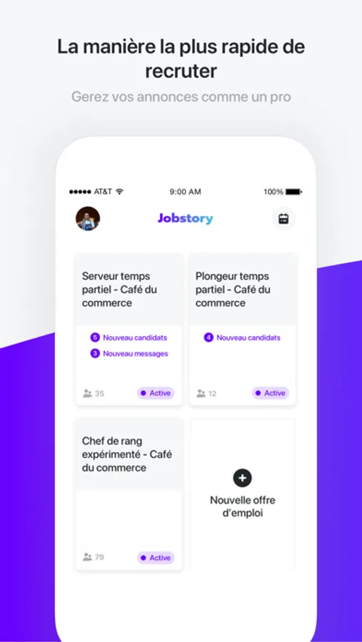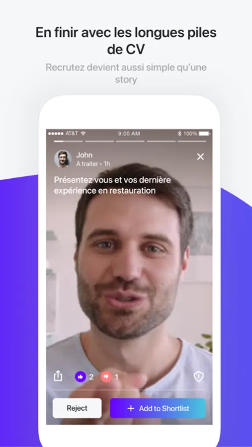 Jobstory is the first 100% dedicated video recruitment application. Recruiters can post job offers by adding 5 questions of their choice for candidates. Candidates can view the offers and apply at any time by answering the 5 questions by filming themselves with their phone. The recruiter receives and views the applications in the form of stories and can thus select and contact the candidates of their choice. Candidates thus have 5 minutes to convince the recruiter, without suffering any form of discrimination based on address, name, date of birth, etc. The recruiter manages all of their recruitments in the application in a minimum amount of time.