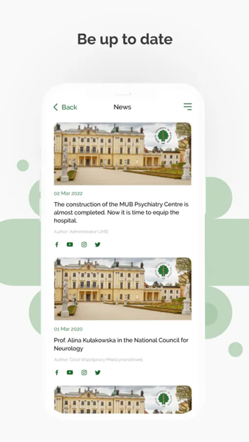 The myMUB mobile application is a tool meant to facilitate the functioning of English-speaking students, PhD students and scientists at the Medical University of Bialystok (MUB) as well as their quick integration with the entire MUB academic community.
