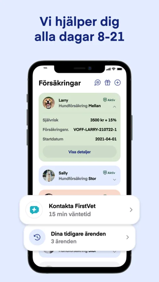 Du når oss snabbast via chatten i appen med en svarstid på 1 minut! Vi har Sveriges schysstaste öppettider och håller dig gärna i handen genom hela livet med din hund eller katt.