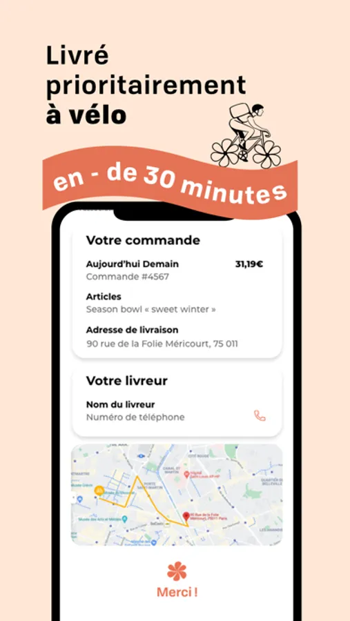 Get your order delivered in about 30 minutes by a professional courrier on a bicycle.