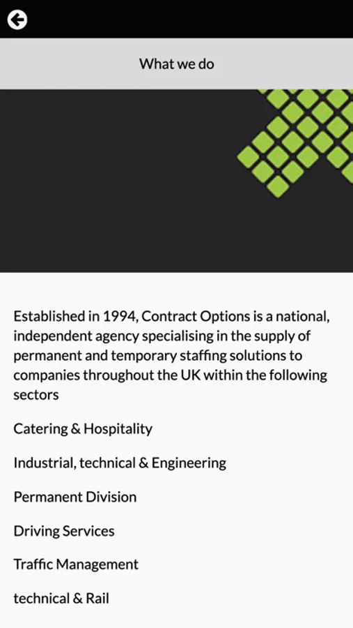 Established in 1994, Contract Options is a national, independent agency specialising in the supply of permanent and temporary staffing solutions to companies throughout the UK within the following sectors: