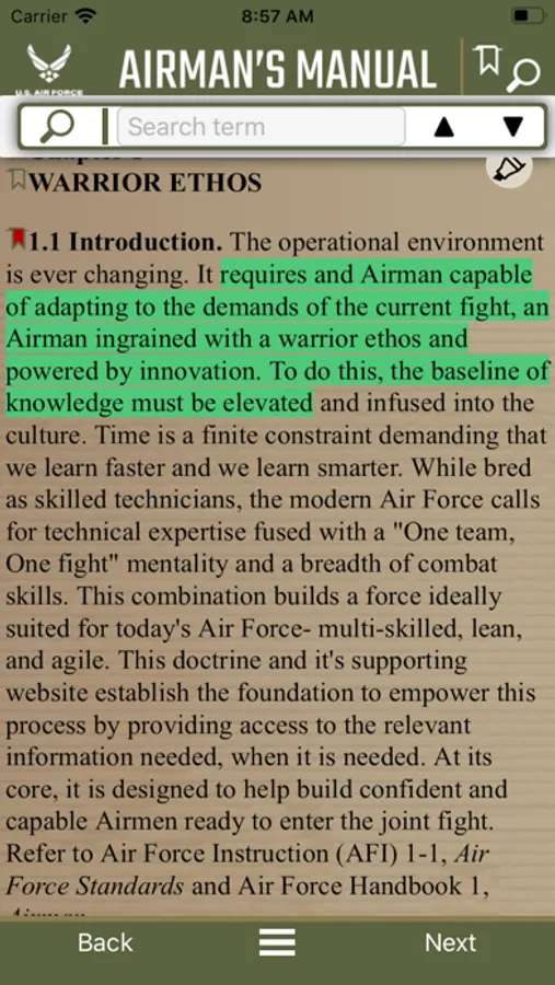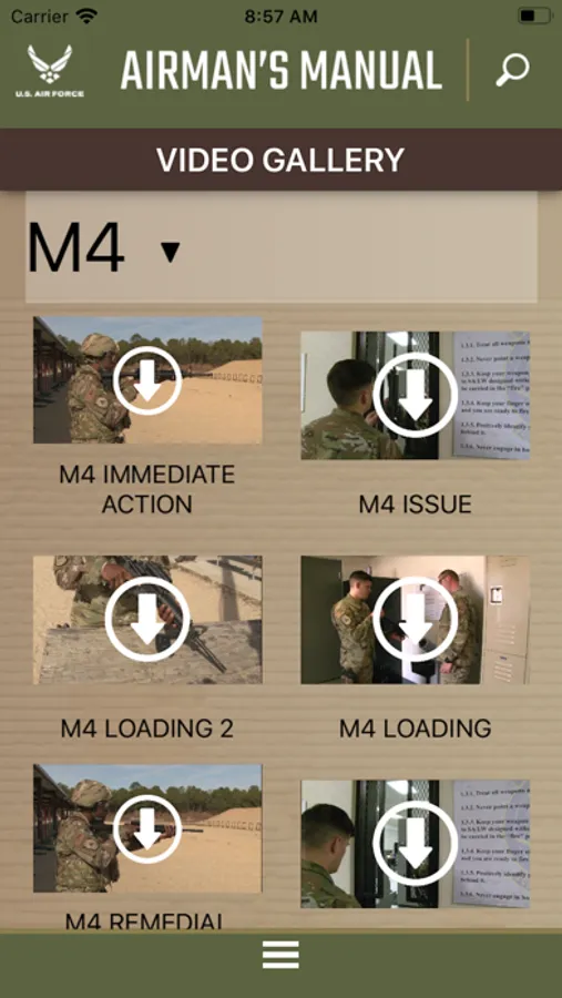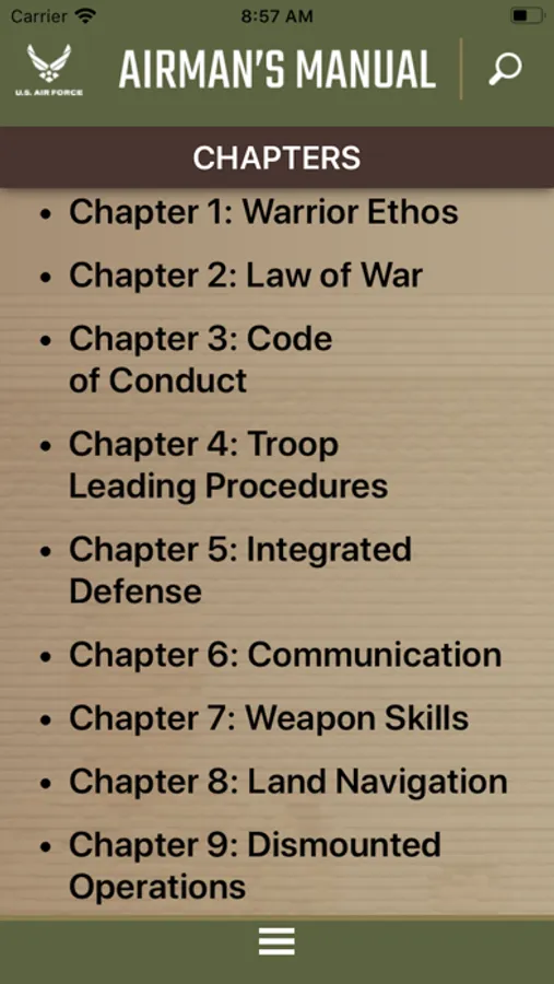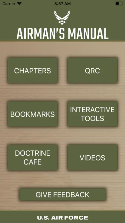The U.S Air Force Airman's Manual mobile application includes 24 chapters of U.S. Air Force applicable information, ability to bookmark chapters and highlight text, as well as access to Quick Reaction Checklist, U.S.A.F. doctrine and videos. This application also allows the Airman to provide feedback.