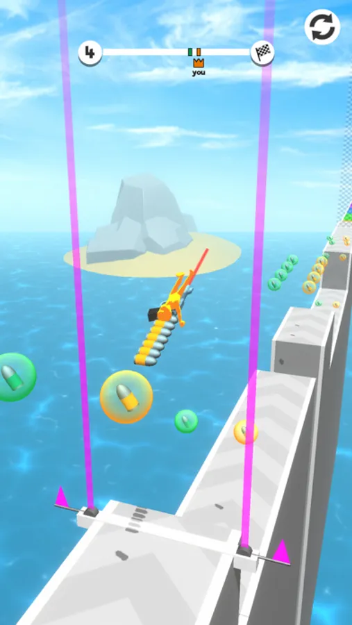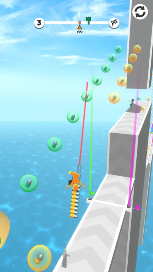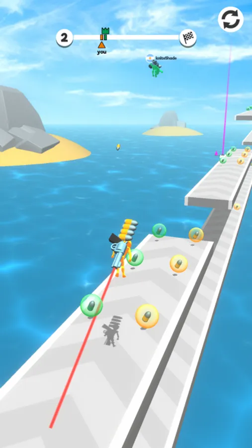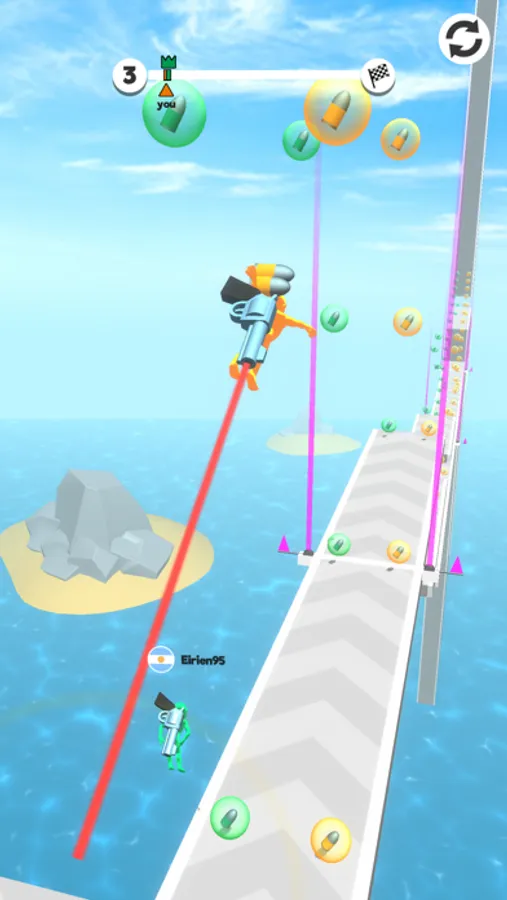 Fire, and flip in the air to cross the line before your opponent. Watch out ammos are not infinite so don't forget to pick some up!