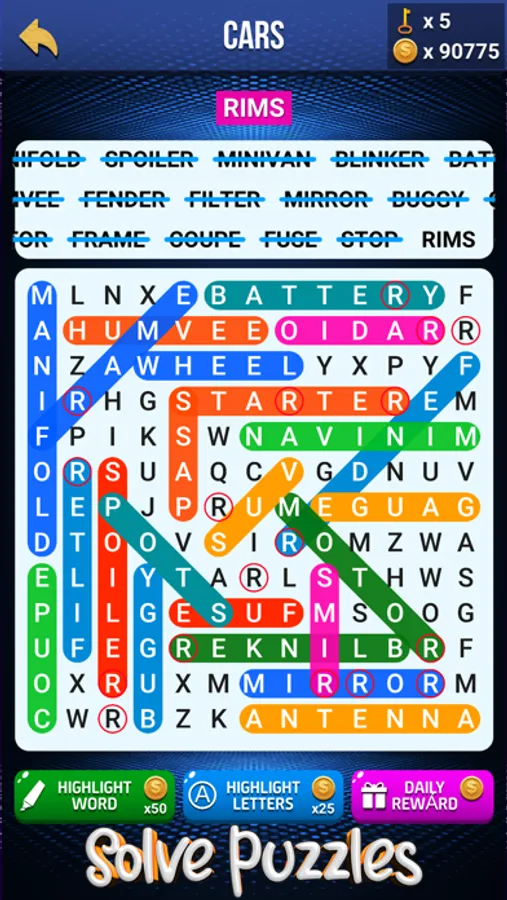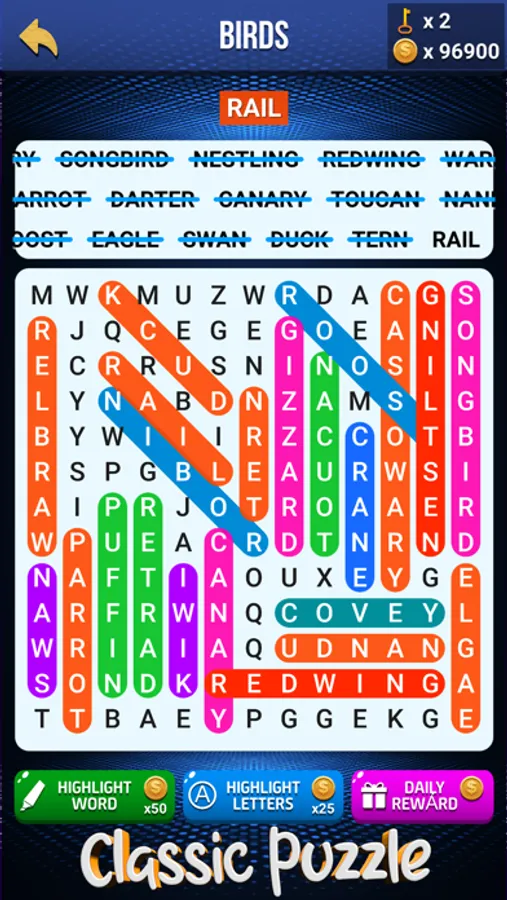 • Each puzzle has a clue to which all words are related. Use it to find words!