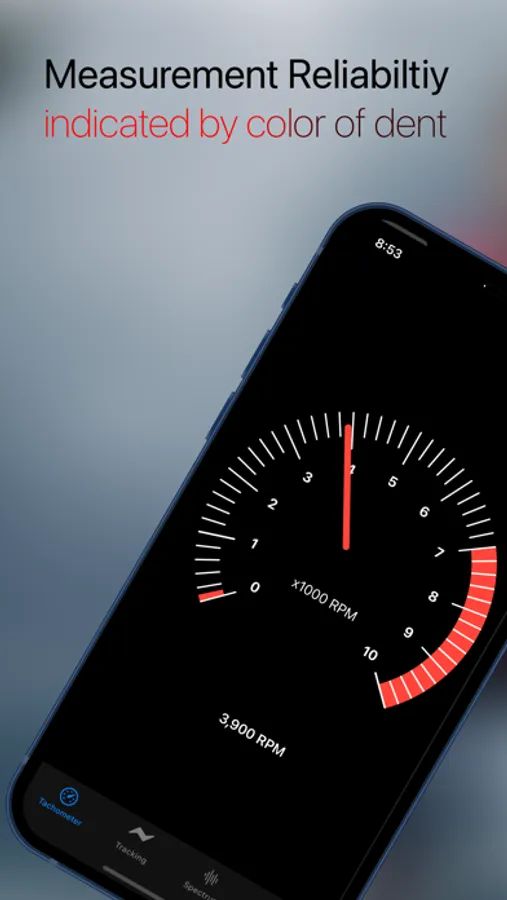 The result of this estimation is shown in three different views. The tachometer view displays the rotational speed at a glance. The color of the dent indicates how clear the measurement is. You can swipe the red ring control and improve the result by specifying the expected RPM range.