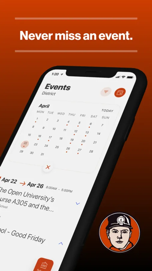 The event section shows a list of events throughout the district. Users can add an event to your calendar to share the event with friends and family with one tap.