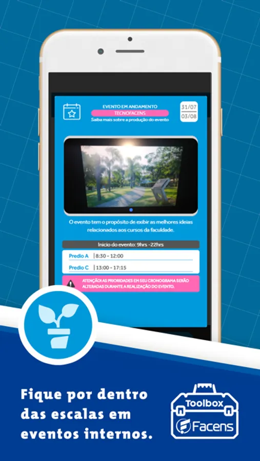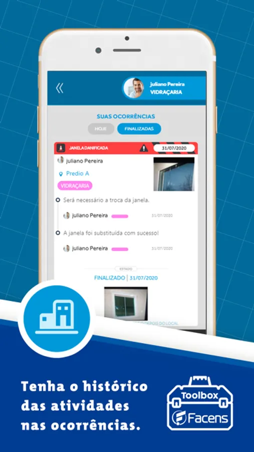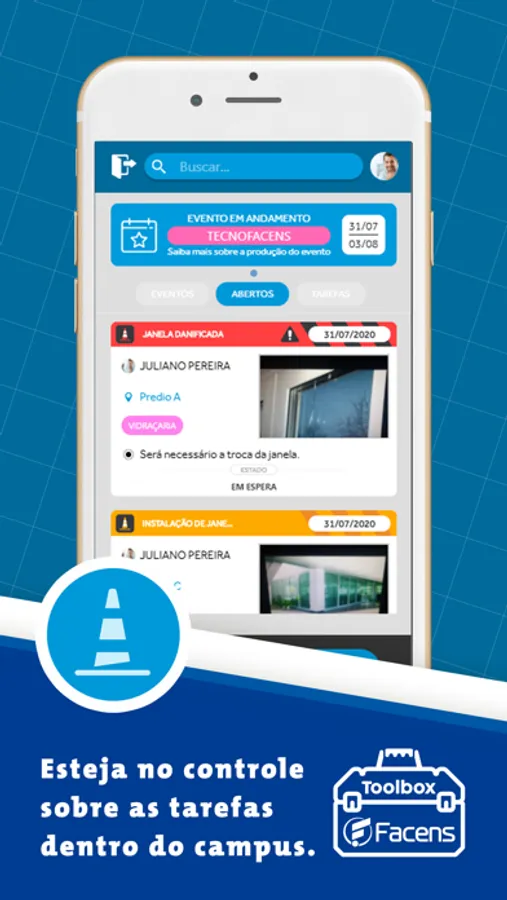 Ocorrências e relatórios, Toolbox Facens veio para auxiliar com o registro e gerenciamento de diversas atividades em todo o campus do Centro Universitário Facens. Envie fotos, descreva o ocorrido e conecte sua equipe para solução de problemas de forma simples e ágil, ajudando na manutenção do espaço e na comunicação entre funcionários.