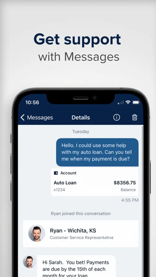 Get support with Messages – If you have a question or need help with your accounts, you can start a conversation with customer service at any time online or through the app. A customer service representative will be there to assist you as soon as possible during our support hours. You can even quickly reference specific accounts, transactions, or payments in your message to keep the conversation running smoothly.
