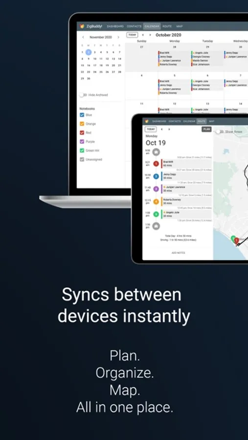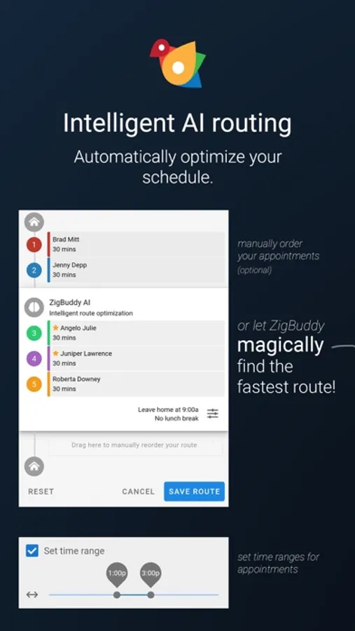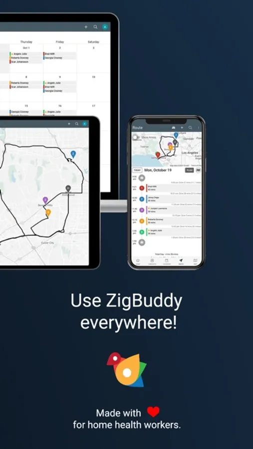ZigBuddy is HIPAA complaint with world-class database encryption. With Intelligent route optimization, you get the fastest route with a click of a button. Need to see someone within a specific time range? That's easy. Just pick a time range and ZigBuddy AI will calculate the best route. (For those who like figuring things out themselves, you can manually organize your day)
