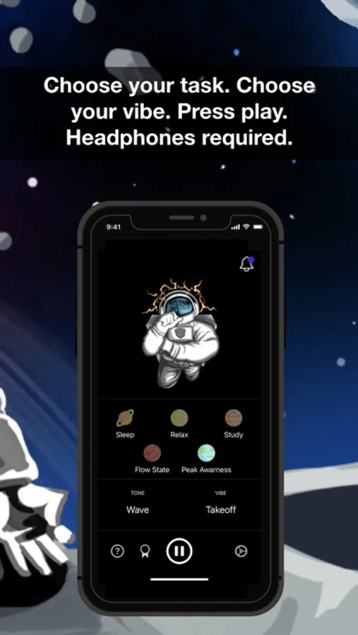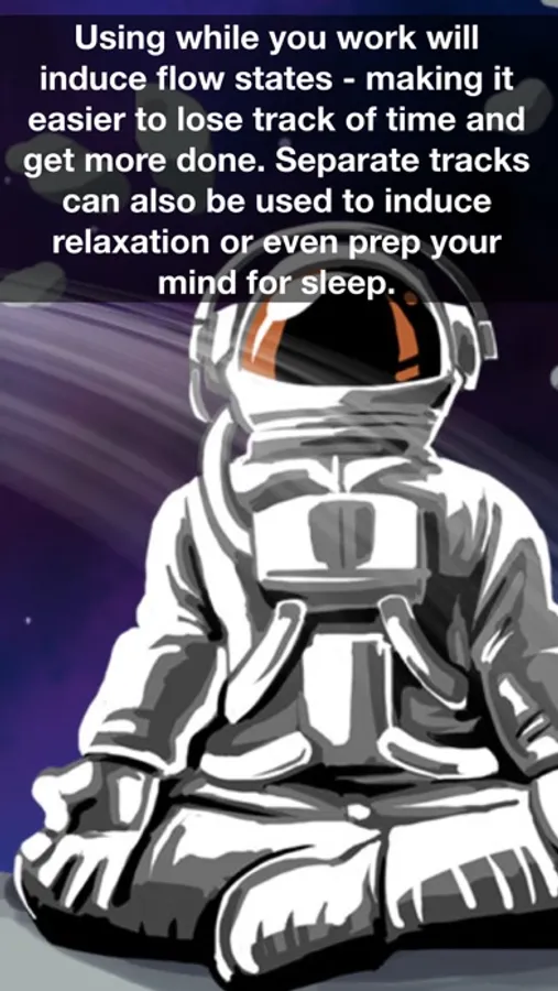 Based on which task you’re trying to accomplish, our tech will auto-DJ frequencies that will adjust your brainwaves to the optimal mental state required to accomplish that task. We’ll be broadcasting different frequencies into each ear - so please wear headphones.