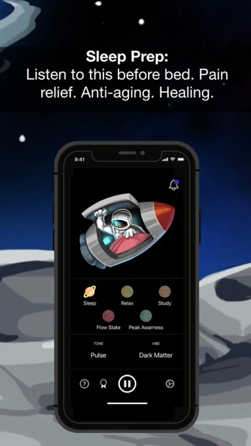 Login to free mobile app (NO DOWNLOAD FEE, NO ADS, NO SUBSCRIPTIONS, NO CATCH). Pick the task you’re about to start doing (such as sleeping, working, or brainstorming), then the tone (this is just a preference), and then the vibe (this is our proprietary ambient music; pick the one you want to listen to while you accomplish your task).