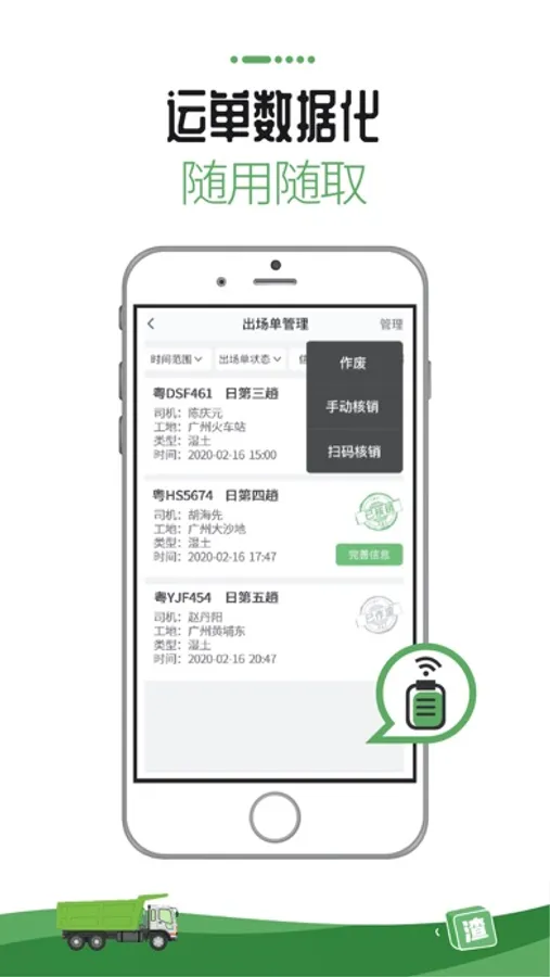 【电子联单】硬件放行设备直接链接智能终端, 实时在线打印通行证,提升渣土车放行效率;数据电子化,对账更方便,杜绝造假