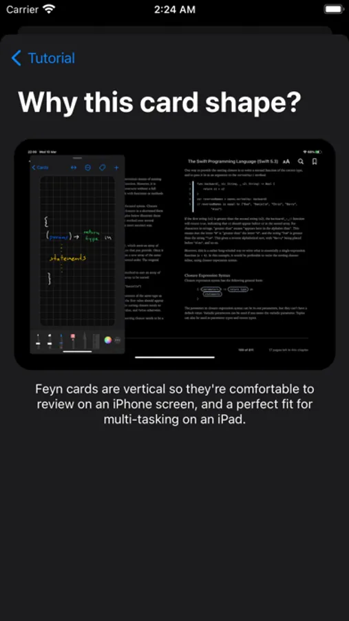 Taking your own notes by hand and spaced-repetition are the best way to learn new concepts, and with Feyn you can do just that. Open up a book on your iPad and comfortably create cards of the most important concepts right there using your Apple Pencil. The cards are phone-sized so that you can then take them on the go and review them on your phone! Their size also makes them easy to write while multi-tasking on your iPad.