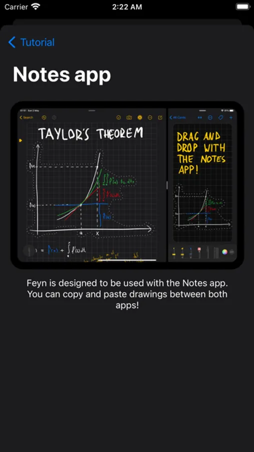 We support iOS features like multitasking for seamlessly creating new notes, and copying and pasting drawings between the iOS Notes app and Feyn to easily convert your lecture notes into cards. The notes will automatically synchronize between your devices using your iCloud drive. We also support iOS' Quick Note, Handoff, and have a macOS app.
