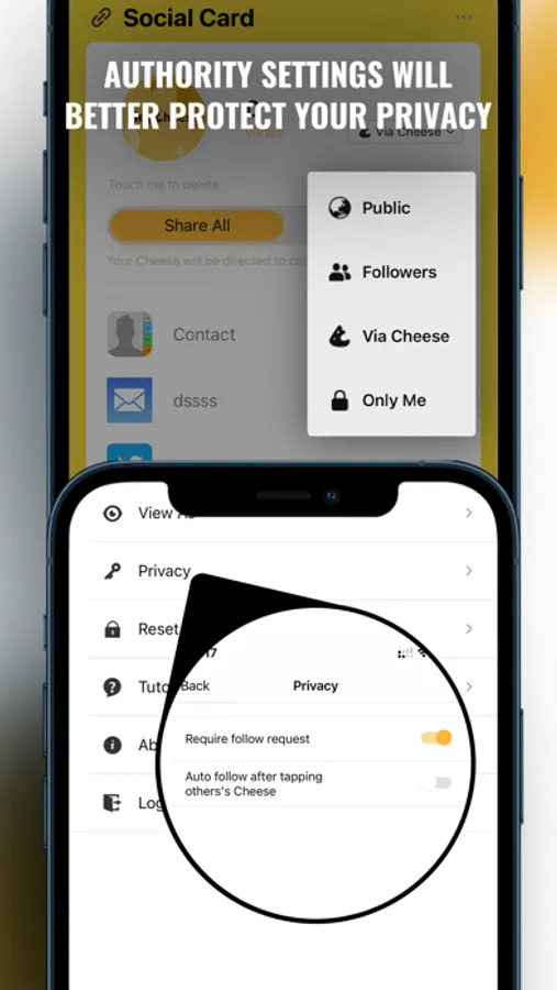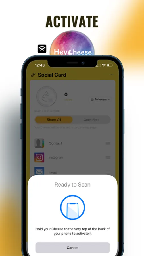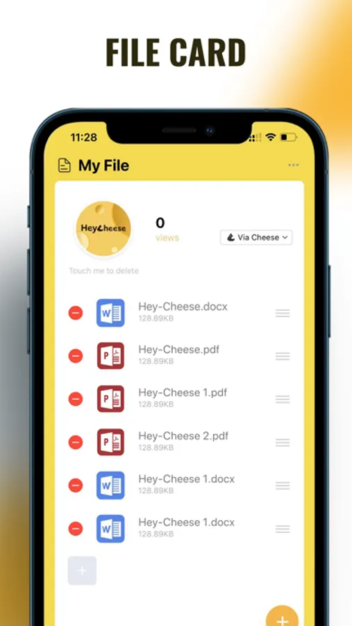 HeyCheese is a software which facilitates instant face-to-face files transfer, socialism, and customized information sharing. Under certain circumstances, we may be bothered with how to send files or download pictures. If we send them by email, we need to enter email address. Others also need to open mailbox to download them. HeyCheese makes things easy! All you need is to set up the file or picture which you would like to share via HeyCheese, once others tap your “Cheese”, the file or object will be directly downloaded. Of course, you can have several "Cheese" with different functions at the same time, one for file sharing, one for work information sharing, one for clubbing, and so on. You can easily manage all your "Cheeses" through HeyCheese app. You can also tap her "Cheese" to add friends, follow her social media account and give him likes. And when other people taps your "Cheese", they become your followers. We always place great emphasis on information security, and we have encrypted every Cheese. If your Cheese is lost or stolen, you don't need to worry about the information or identity theft. Simply delete the lost cheese in your HeyCheese app, then others will not have access to it.