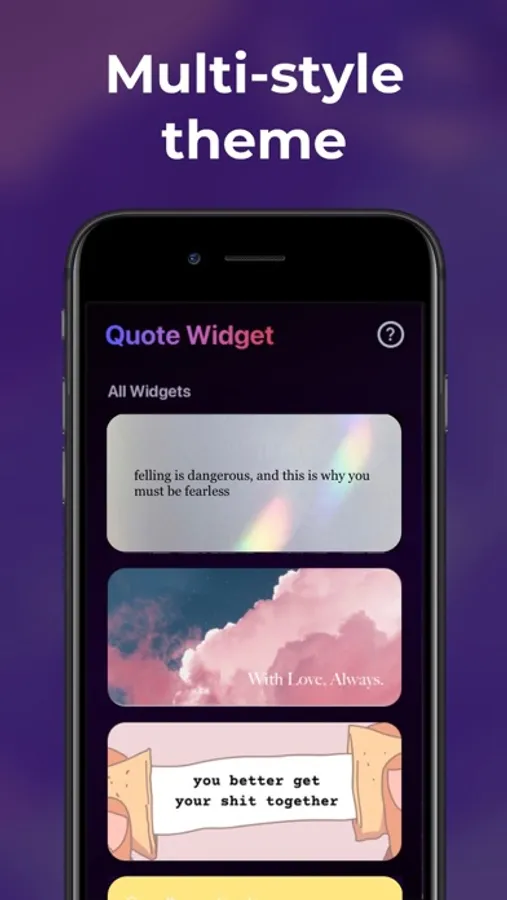 The best quotes widget app in the App Store, ""Quote Widget"" delivers lots of daily quotes for you, and you can input your favorite quotes with unique phone themes. Each widget can be precisely customized to your favorite functions and appearance.