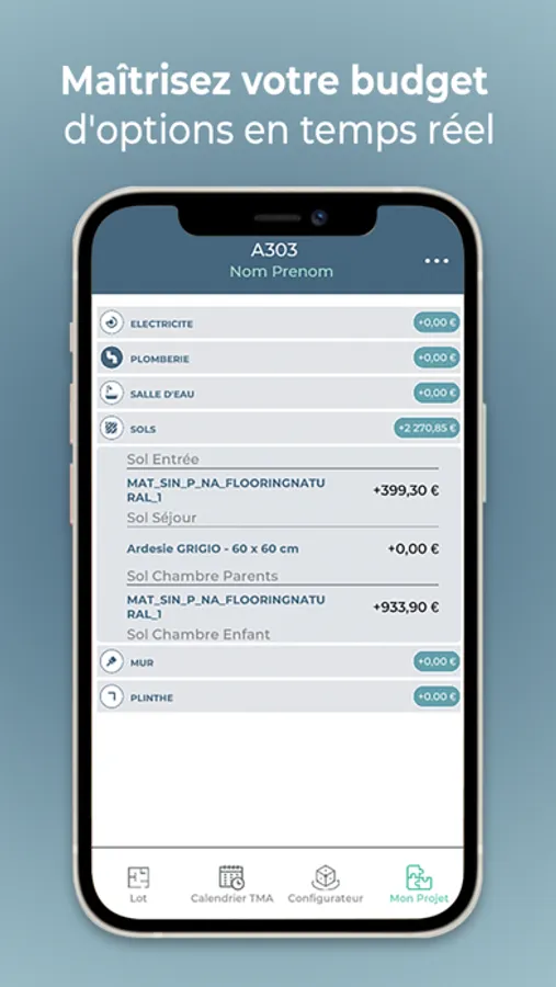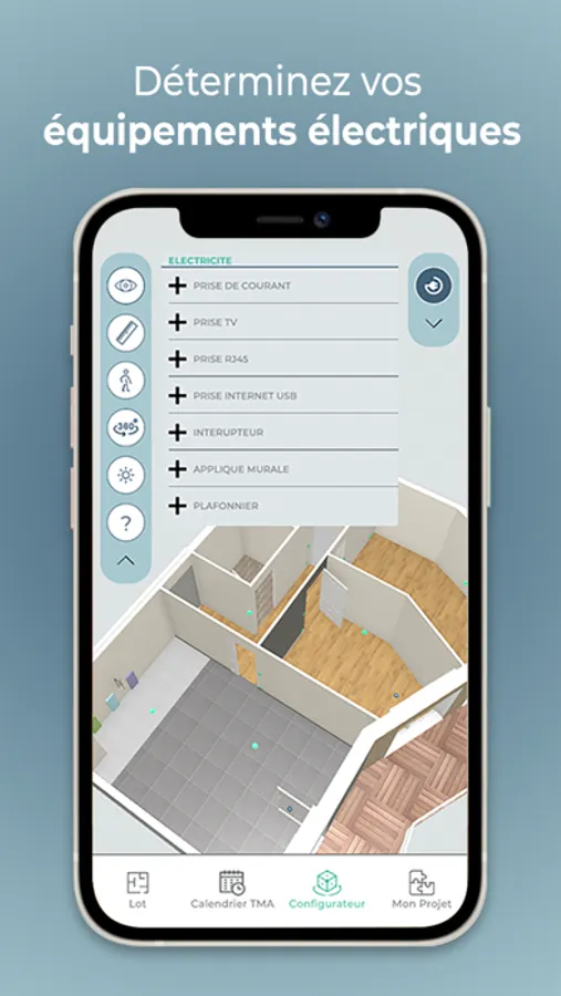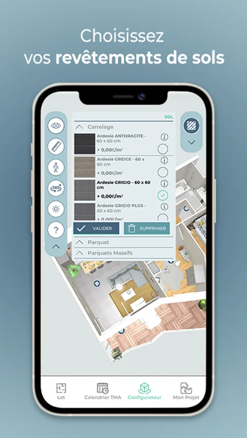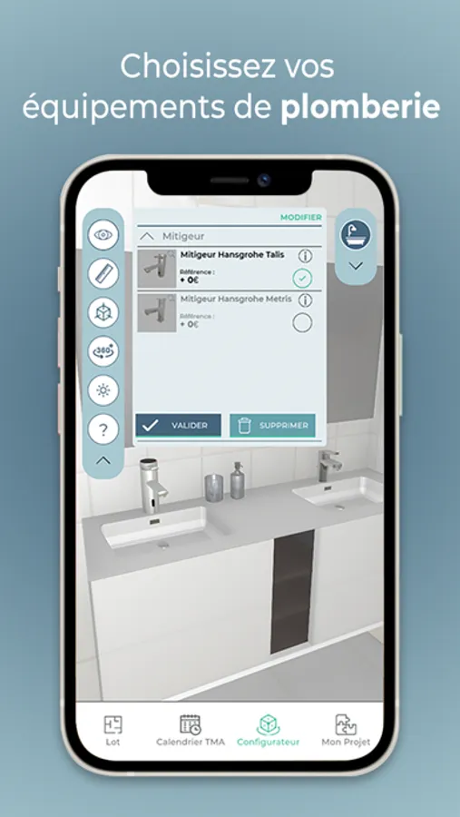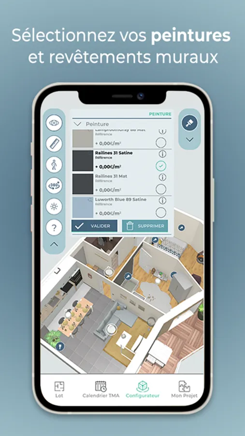 Choisissez vos revêtements de sols, vos peintures murales, votre robinetterie, vos parois de douche…