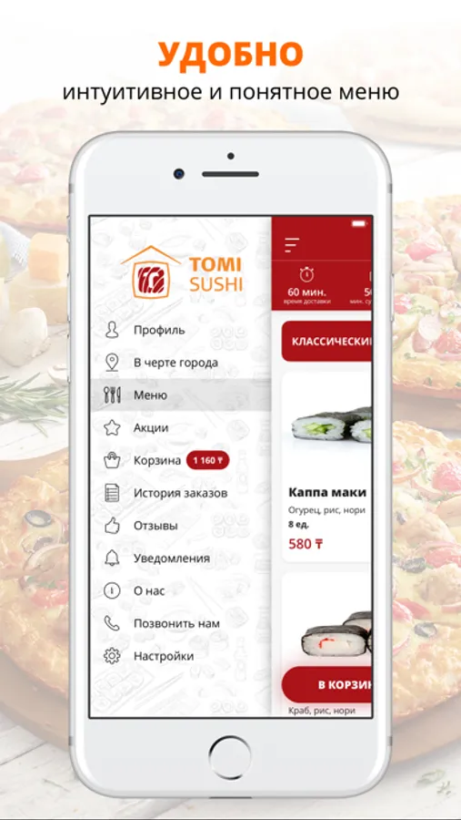 Устанавливайте приложение Tomi Sushi и получайте онлайн-доступ к нашему сервису доставки в любое время и в любом месте.