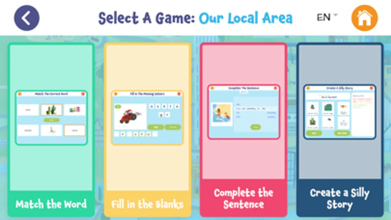 There are four different styles of game including: (1) Match the Word (2) Fill in the Blanks (3) Complete the Sentence (4) Create a Silly Story. There are also two different levels of complexity within some of the games.