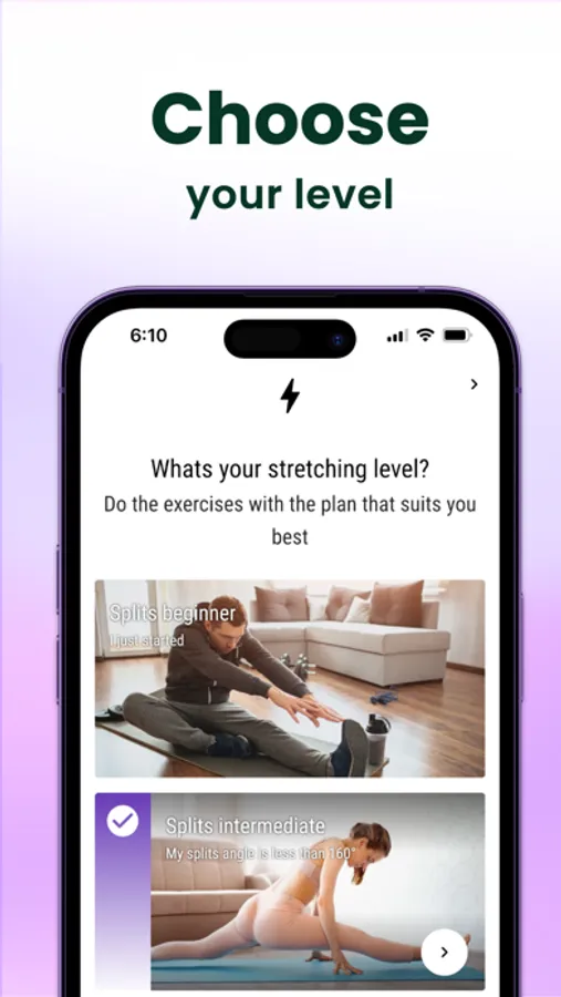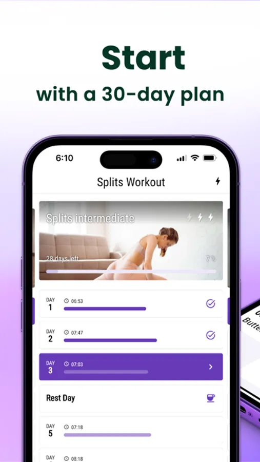 ** The Do the Splits in 30 Days app offers a variety of stretches for flexibility, as well as a step-by-step guide for beginners who are just starting with splits training. The app also includes stretch training for back pain. So to get a healthy body and core, try our app and learn splits effortlessly.