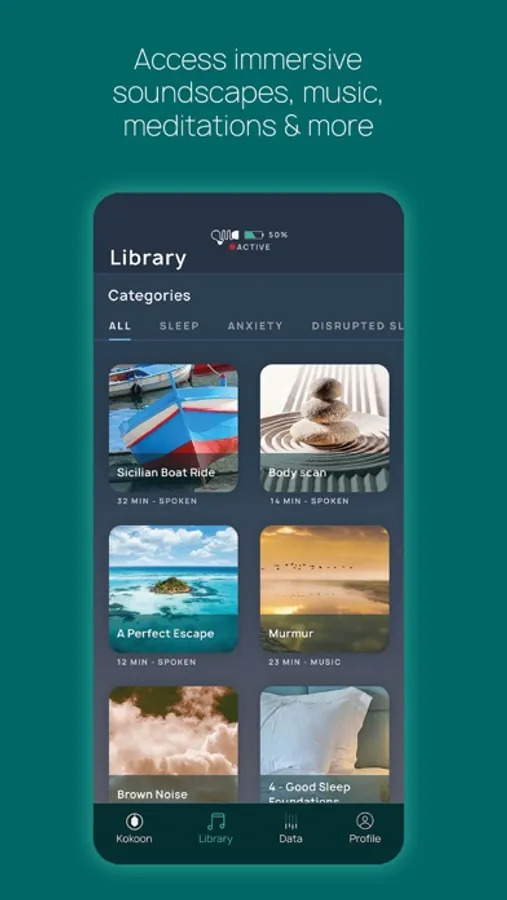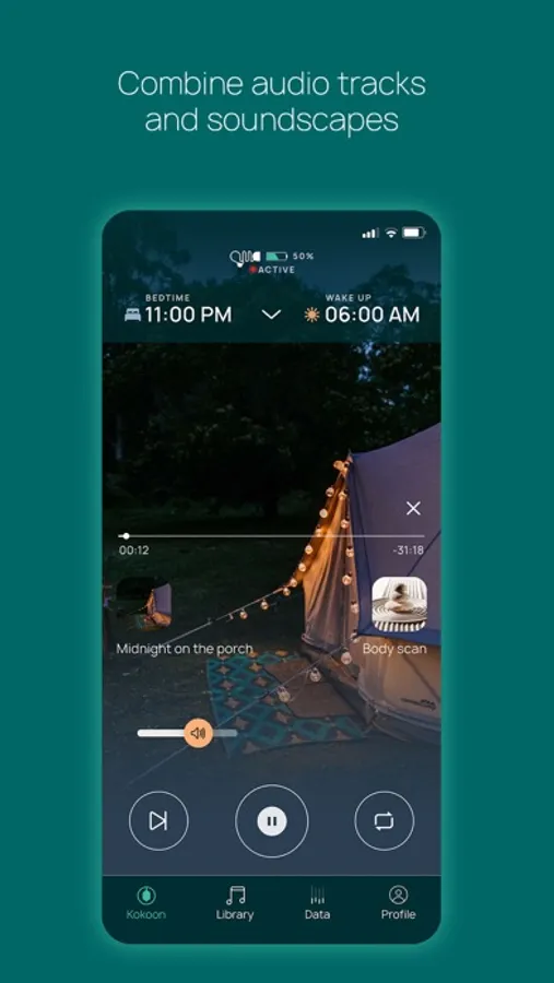 Original content library - includes different types of audio tracks for sleep: coloured noise, soundscapes and music as well as a variety of spoken word audio to deepen your understanding of your sleep or practise different relaxation techniques.