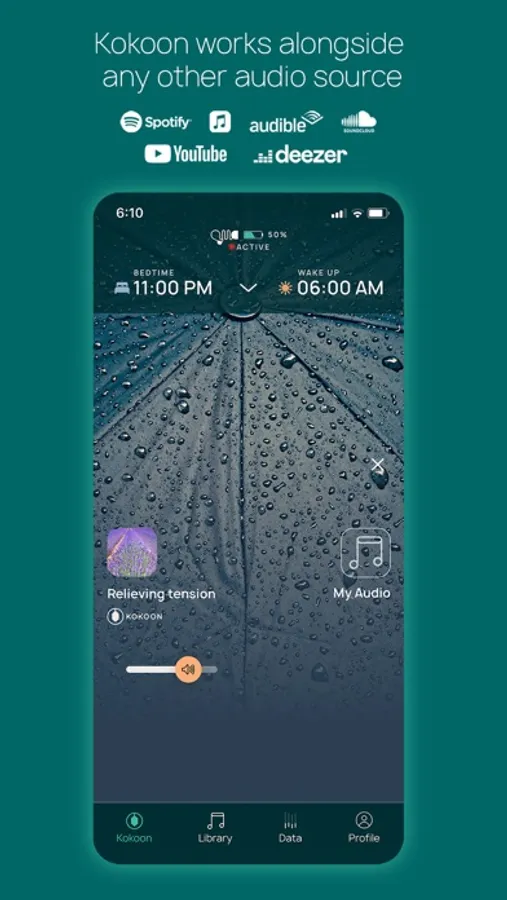 Use audio from any audio app - e.g. Audible, Spotify, Podcasts etc. It works with whatever you like to listen to when relaxing.
