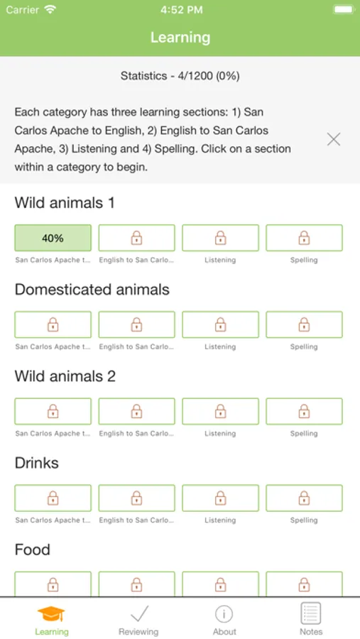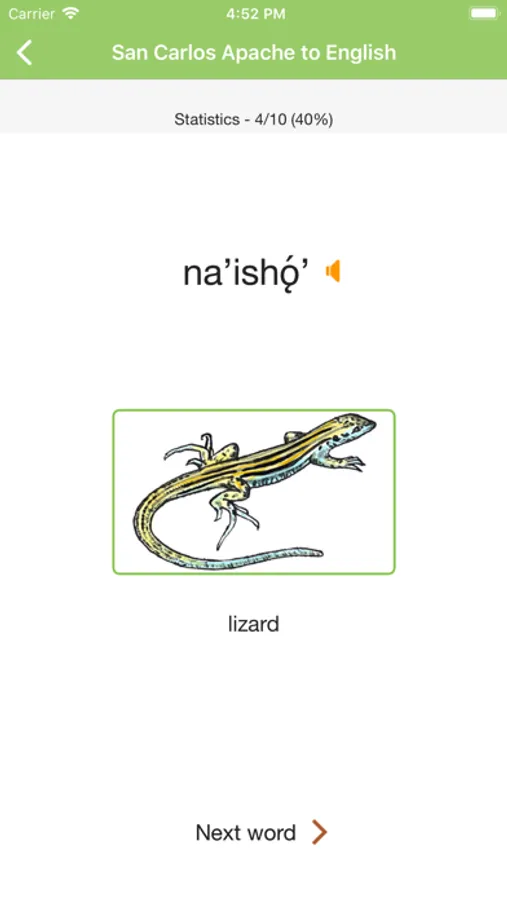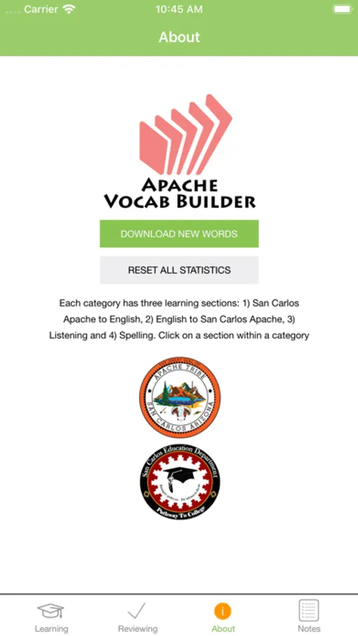 Build your San Carlos Apache vocabulary with the San Carlos Apache Tribe's FREE vocabulary game for your iOS phone or tablet. Quiz yourself every day to learn different categories – wild animals, food, drinks, and more! The app includes: