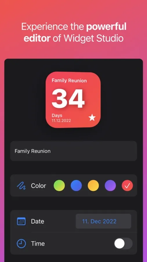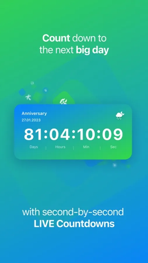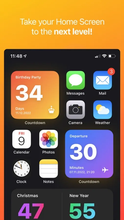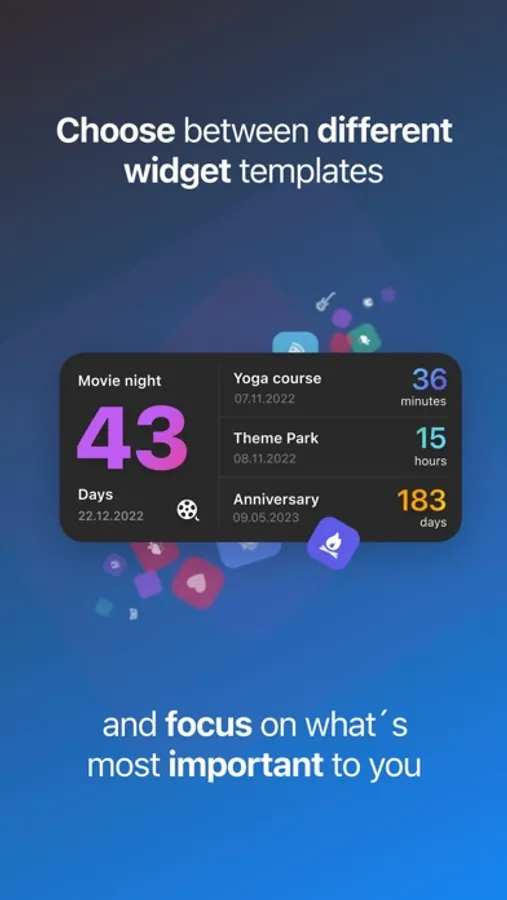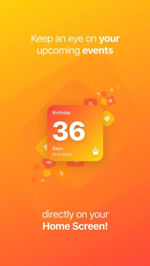 Keep an eye on your upcoming events - directly on your Home Screen! Create minimalistic widgets that countdown to the big day.