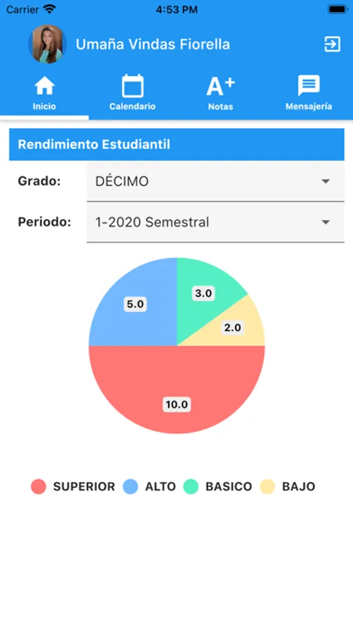 • Rendimiento estudiantil: muestra un gráfico que resume el estado del estudiante en el año en curso.