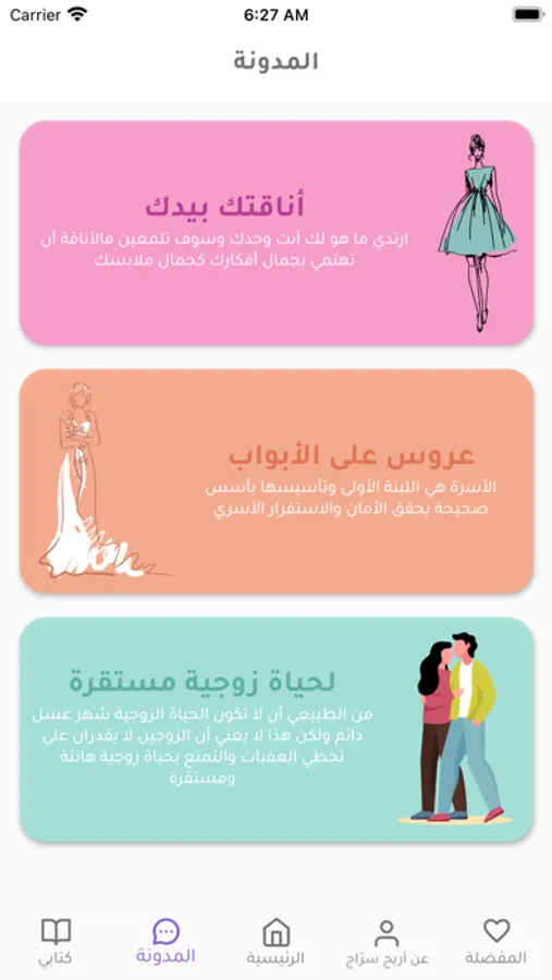 تجدون في هذا التطبيق مواضيع متنوعة ومتجددة عن الأناقة والسلوك الملبسي والإتيكيت والذات والحياة والتخطيط وتجهيزات العروس والعلاقة الزوجية وكتاب (تصميم الأزياء - رسم وتلوين).