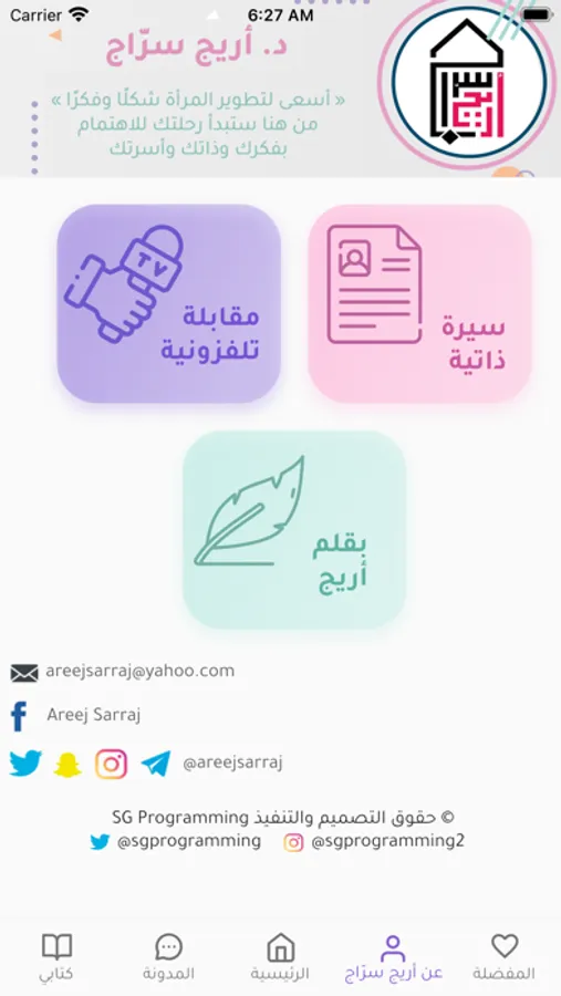 التطبيق يجمع لك مدونات أريج سرّاج من حسابات (areejsarraj) على مواقع التواصل وكتاباتها ومطبوعاتها المنشوره في مكان واحد.
