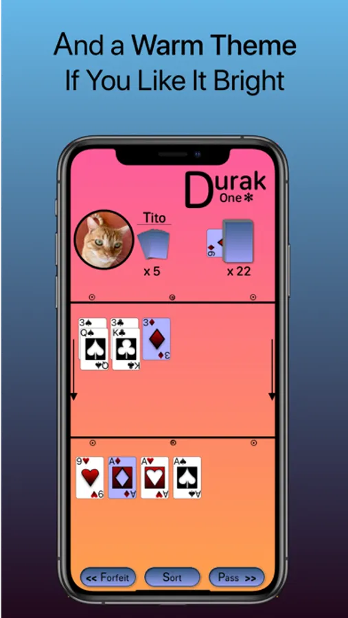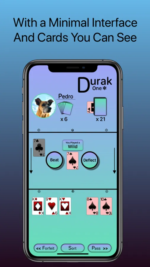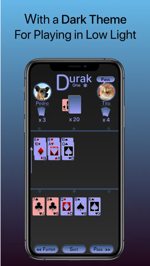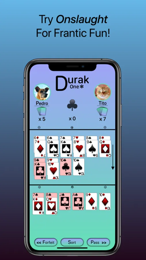 In this solitaire version, take on one or two opponents in any variety of Durak games. Challenge yourself to become a better player. Play with the traditional 36-card deck, or use all 52 cards. Add in Jokers for a fun twist. Deflect attacks and become the attacker in mid-turn. Try Spades by Spades for a surprisingly tough game, or Onslaught for a hectic free-for-all.