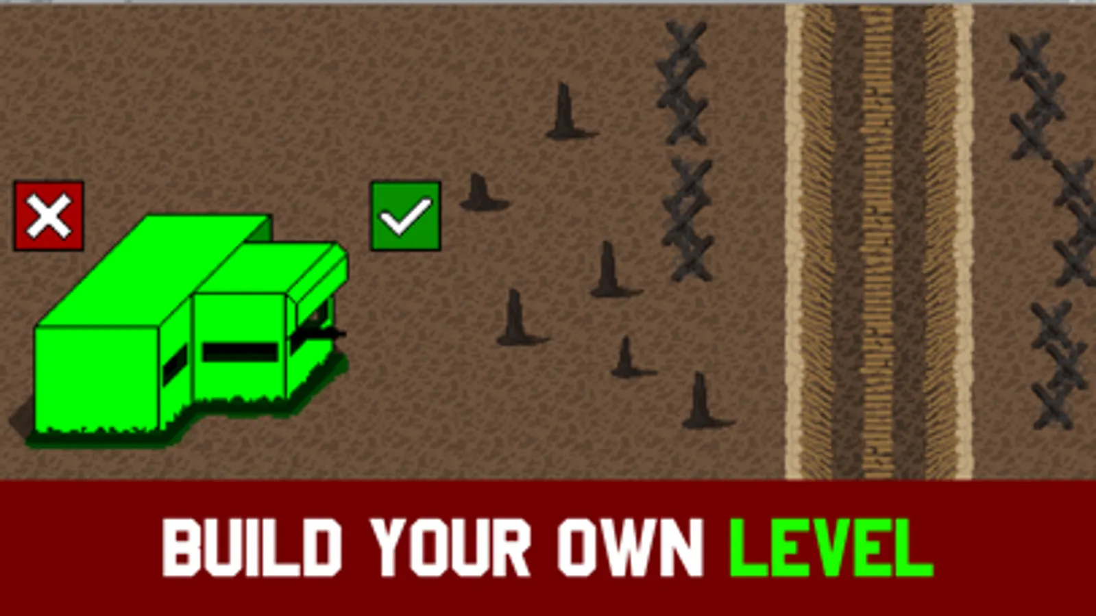 Build your battleground in the creative/sandbox mode according to your own strategy. Place decorations, armor bunkers / army buildings, barbed wire and tanks to sitotamulate a total war against the enemy army!