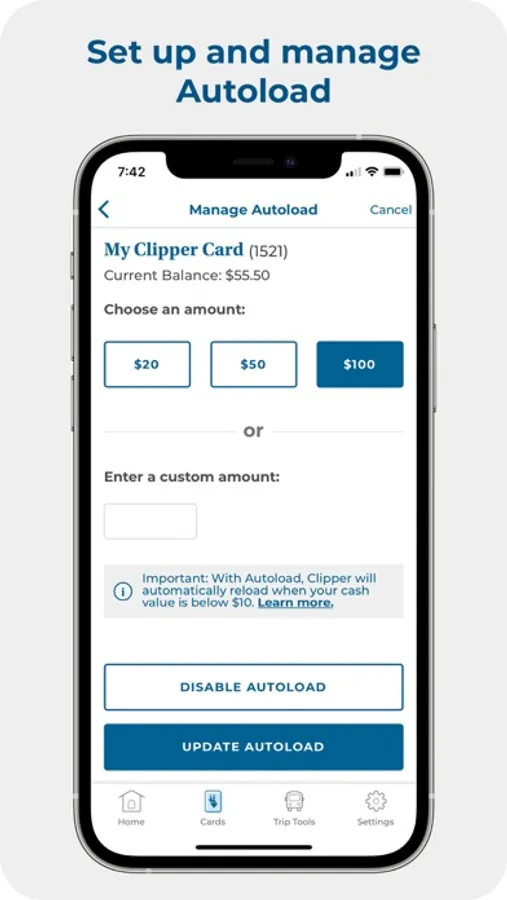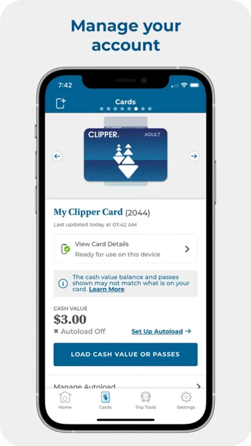 The Clipper app gives you the same account access as the website, but on your iPhone! You can register a new card, load cash value and transit passes, set up Autoload, view your recent activity, and other features. Sign in and out of multiple Clipper accounts in the Clipper app to manage a card on behalf of someone else.