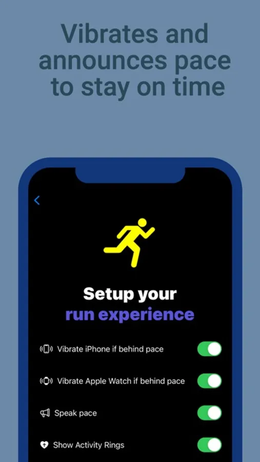 - Notifies you if your pace time drops below your target. Your App and Watch can vibrate when this happens!