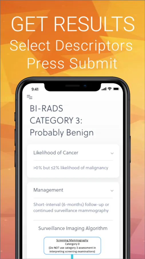 The content of the app including the terminologies, definitions, measurements and categories follow the guidelines laid down by the ACR BI-RADS 5th edition. The various combinations of mammogram descriptors leading to final categories, however, are inclusive of but not limited to those suggested by the Atlas. An effort has been made to review and compile the results of various peer reviewed studies done on breast cancer categorization, to give a more comprehensive and robust diagnostic algorithm.