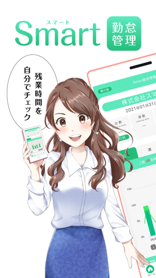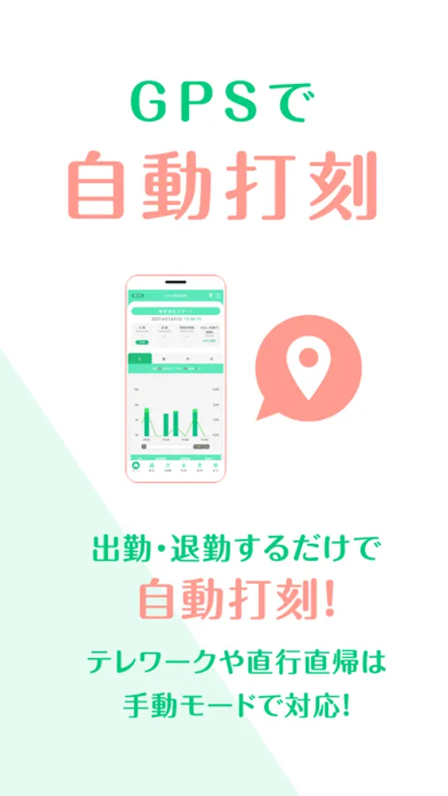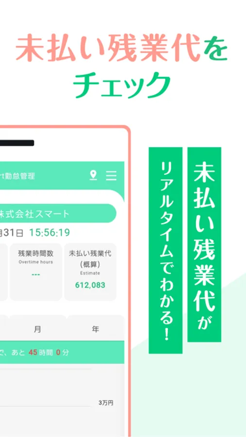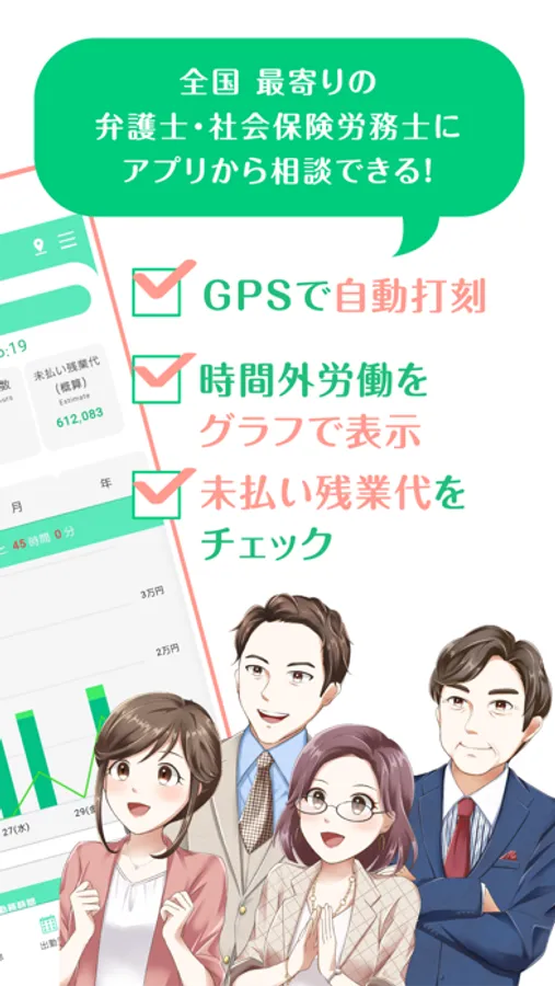 利用者が登録した勤務先に、当該登録した端末が半径200メートル以内に進入及び退出した場合、GPSによって自動で出勤を打刻します。高層ビル等の電波障害がある場合、手動でも打刻することが可能です。1日、1週間、1ヵ月、1年、それぞれの期間ごとに、勤務時間、残業時間、残業代が表示することができます。法定時間外労働の上限(月45時間、年360時間)の管理に役立ちます。