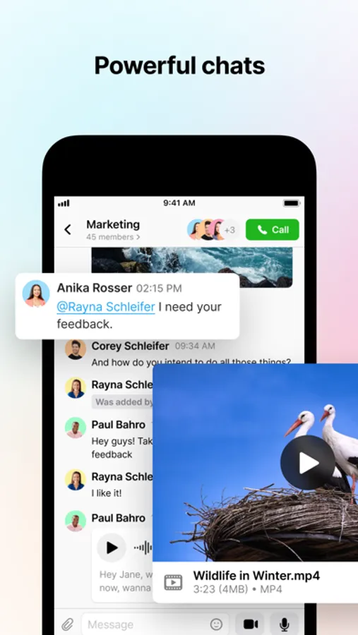 Dedicated channels for group collaboration and secure meetings or 1-1 chats to message people directly. Organize conversations by topic, share documents to get more work done with your team.