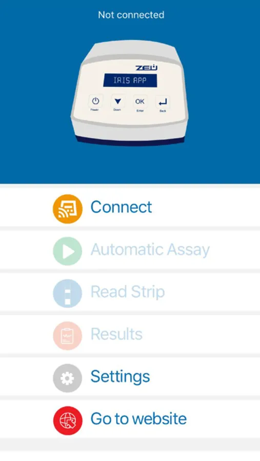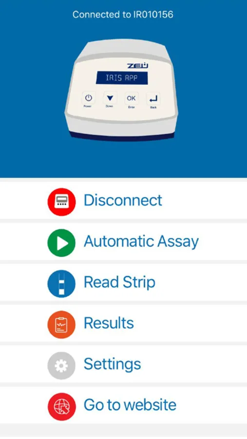 The device connects via Bluetooth to the mobile / tablet through the Iris App to start the automatic test, read or download the results. 4G or Wi-Fi connection enable the results storage in a digital cloud
