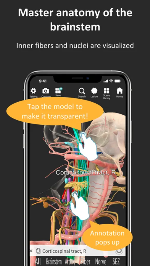 You can study inner structures of the brainstem by tapping the screen: The outline becomes transparent, and you can observe inner nerve fibers or nuclei.