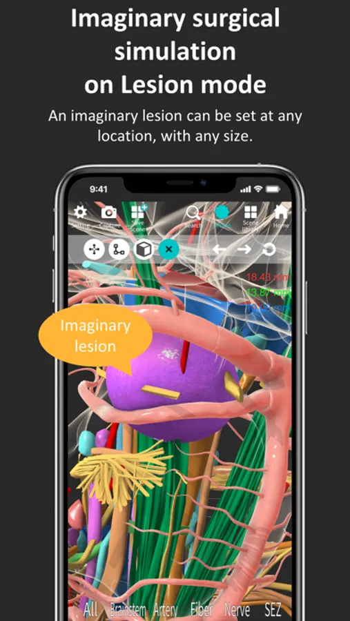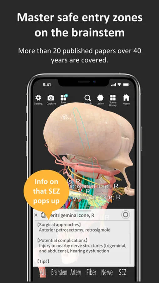 When you tap a safe entry zone (demonstrated in red cylinders), related structures are highlighted, and major surgical approaches, potential complications, and small notes are provided. More than twenty papers or textbooks were consulted to obtain information regarding the safe entry zones to the brainstem, and 26 safe entry zones (16 species) are demonstrated on this App.