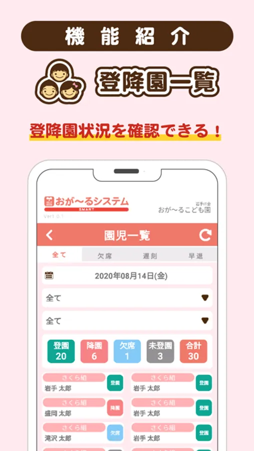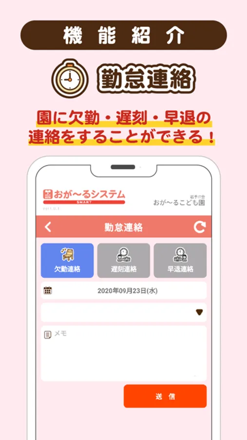 園児の登降園一覧を見る事が出来る「登降園一覧」機能、施設への遅刻連絡・早退連絡・欠勤連絡ができる「勤怠連絡」機能、