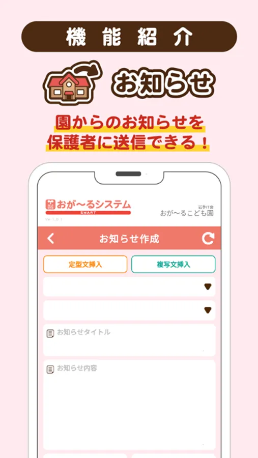 各施設から保護者の皆様への連絡を送信する「お知らせ」機能が利用可能となっております。
