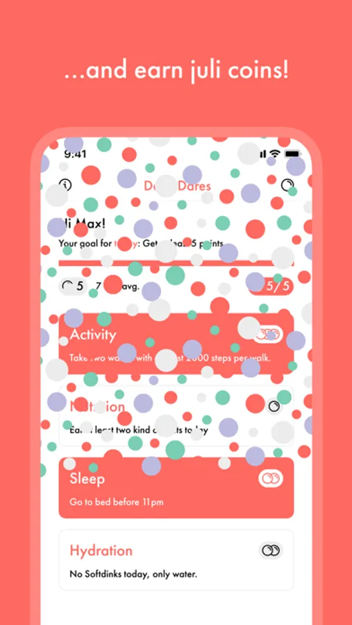 Actually there is no need to: you smartphone, your apple watch, your step counter, or any other smartwatch, they all do this work for you. juli combines all this data to give you the relevant health information at your fingertips: from monitoring your activity, heart rate or sleep, adding external data like sunshine, pollen or air pollution. Juli will also you daily a few quick questions about your condition related wellbeing. Questions like: