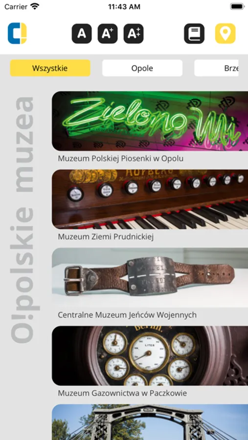 O!polskie muzea - aplikacja mobilna" jest formą udostępnienia najbardziej reprezentatywnych zasobów muzeów z terenu województwa opolskiego. Aplikacja ma charakter współczesnego przewodnika po muzeach. W aplikacji znajduje się ponad 1000 zdigitalizowanych obiektów, wchodzących w skład zasobów 21 muzeów: Centralnego Muzeum Jeńców Wojennych, Muzeum Uniwersytetu Opolskiego, Parku Nauki i Rozrywki w Krasiejowie, Muzeum Powiatowego w Nysie, Muzeum Śląska Opolskiego w Opolu, Muzeum im. Jana Dzierżona w Kluczborku, Muzeum Regionalnego w Dobrodzieniu, Zamku Niemodlin, Muzeum Wsi Opolskiej, Muzeum w Praszce, Powiatowego Muzeum Ziemi Głubczyckiej, Muzeum Regionalnego w Głogówku, Muzeum Wiejskiego „Farska Stodoła” w Biedrzychowicach, Muzeum Ziemi Kozielskiej, Muzeum Gazownictwa w Paczkowie, Oleskiego Muzeum Regionalnego w Oleśnie, Muzeum Hutnictwa Doliny Małej Panwi, Muzeum Piastów Śląskich w Brzegu, Muzeum Ziemi Prudnickiej, Muzeum Polskiej Piosenki w Opolu, Muzeum Politechniki Opolskiej i Lamp Rentgenowskich oraz Muzeum Sztuki Sakralnej w Ligocie Dolnej