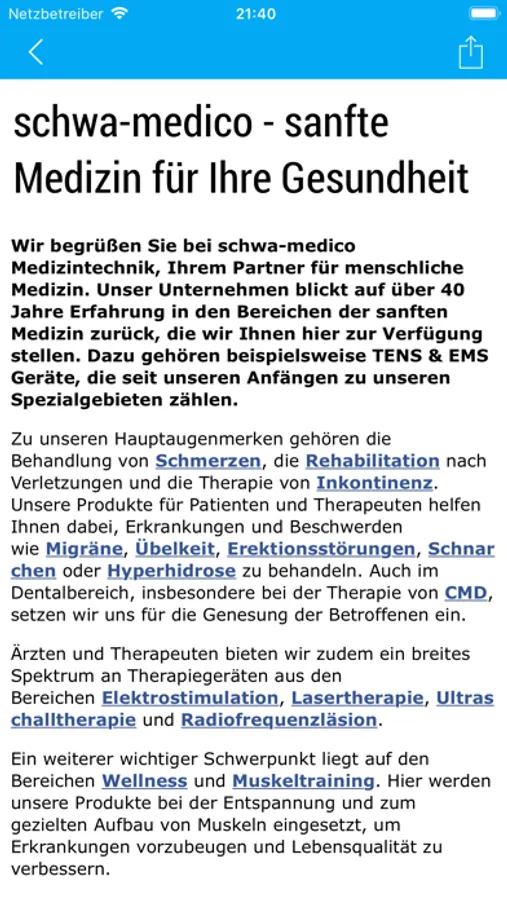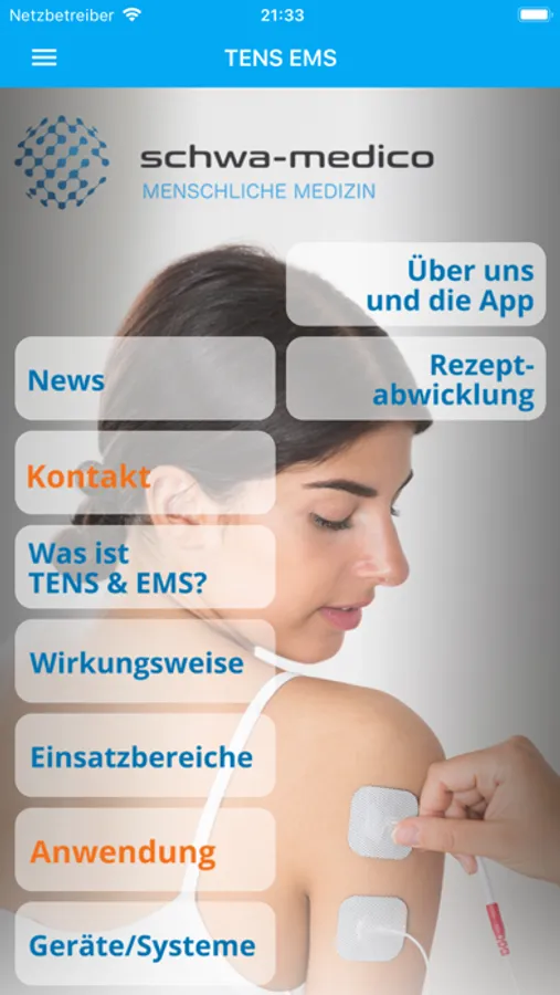 Die TENS/EMS APP beinhaltet serviceorientierte und praktische Module zum Einsatz von TENS/EMS Geräten der schwa-medico Gruppe. Dafür stehen Ihnen Experten, bestehend aus Ärzten, Physiotherapeuten,Schmerztherapeuten, Hebammen, Medizinprodukteberater und Trainer mit Rat und Tat zur Seite.